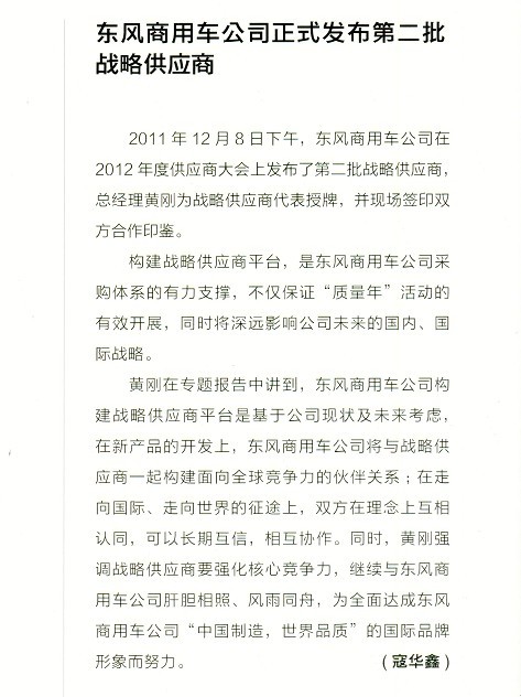 湖北正奧公司榮獲東風商用車公司戰(zhàn)略供應(yīng)商資格